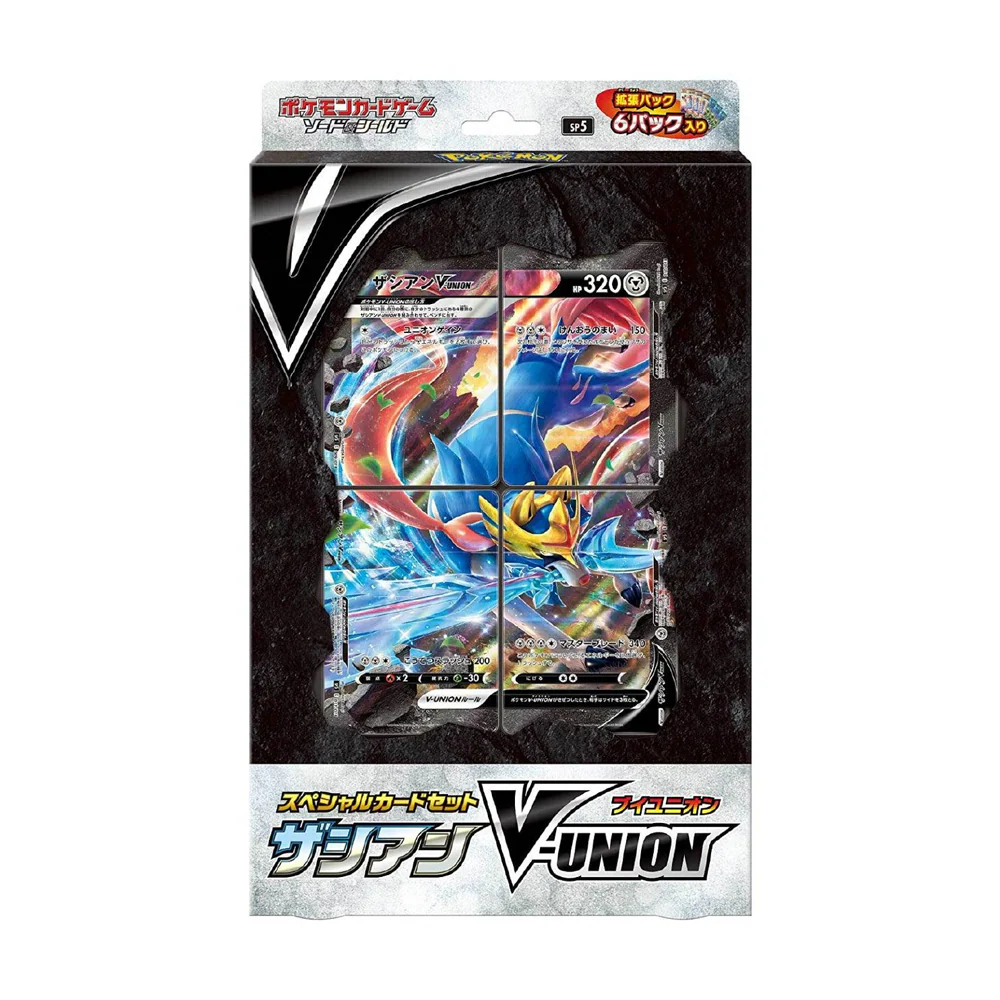 Die Zacian V-UNION Box ist eine Special-Edition-Box, die das Pokémon Zacian als V-UNION-Karte präsentiert. Dabei besteht Zacian aus mehreren Karten, die zusammen eine einzige, besonders mächtige Karte ergeben.